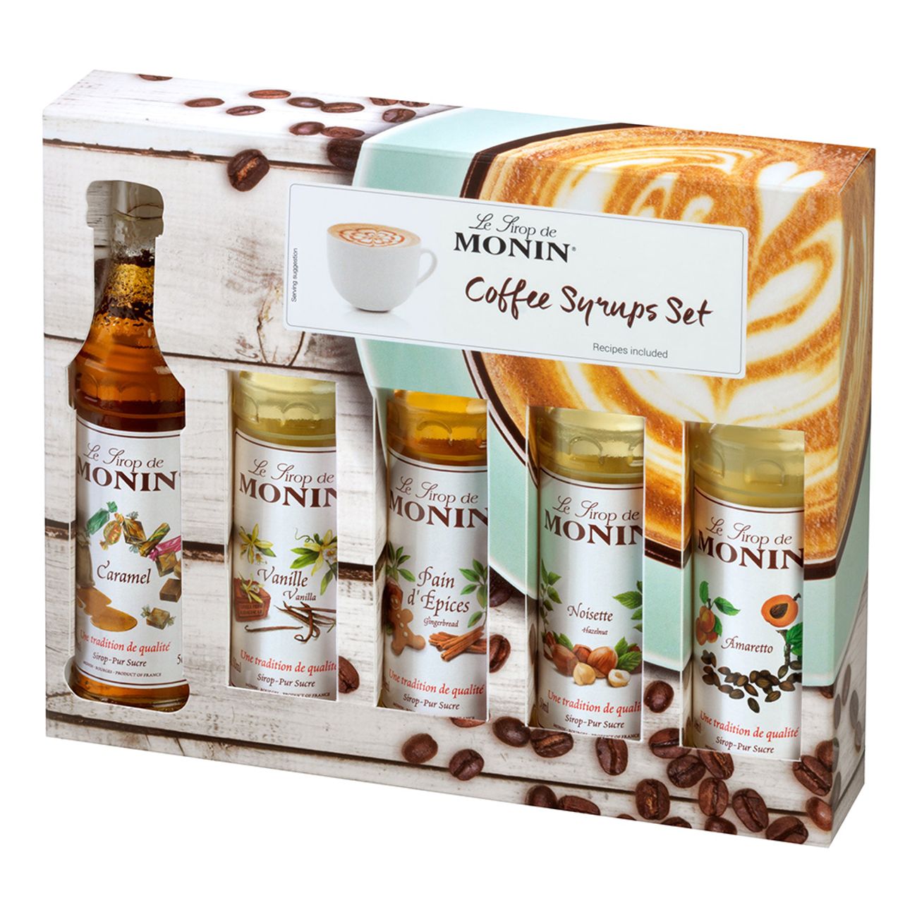 Monin Coffee Set Syrup er et sett med 5 drikkesiruper med forskjellige smaker. 5 x 5 cl. Åpnet flaske holder seg i tre måneder.