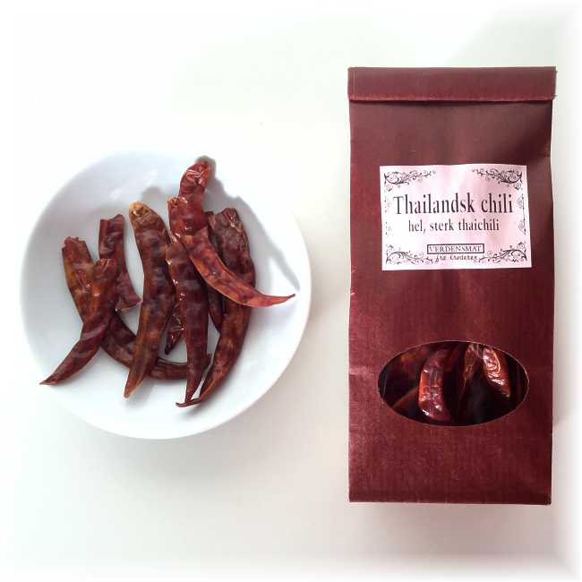 Denne chilien er dyrket og tørket i Thailand. Det er denne som brukes i det meste av matretter i thaikjøkkenet. Thaichili er lange og middels store, men de er svært potente! De kan brukes hele, eller knuses enkelt og brukes som chiliflak.