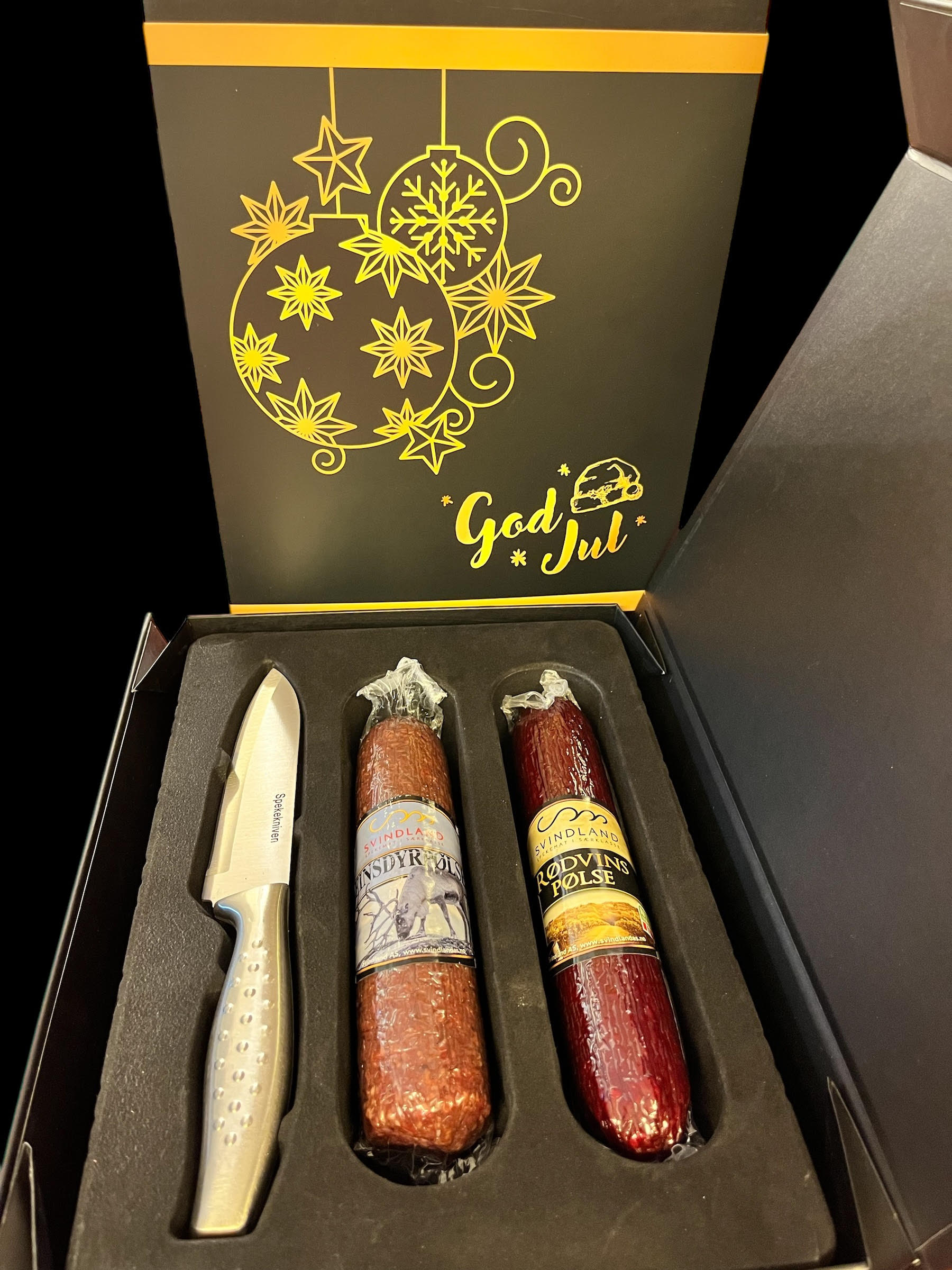 Sort eske med magnetlås og juledekor. Inneholder Reinpølse, rødvinspølse og kniv.