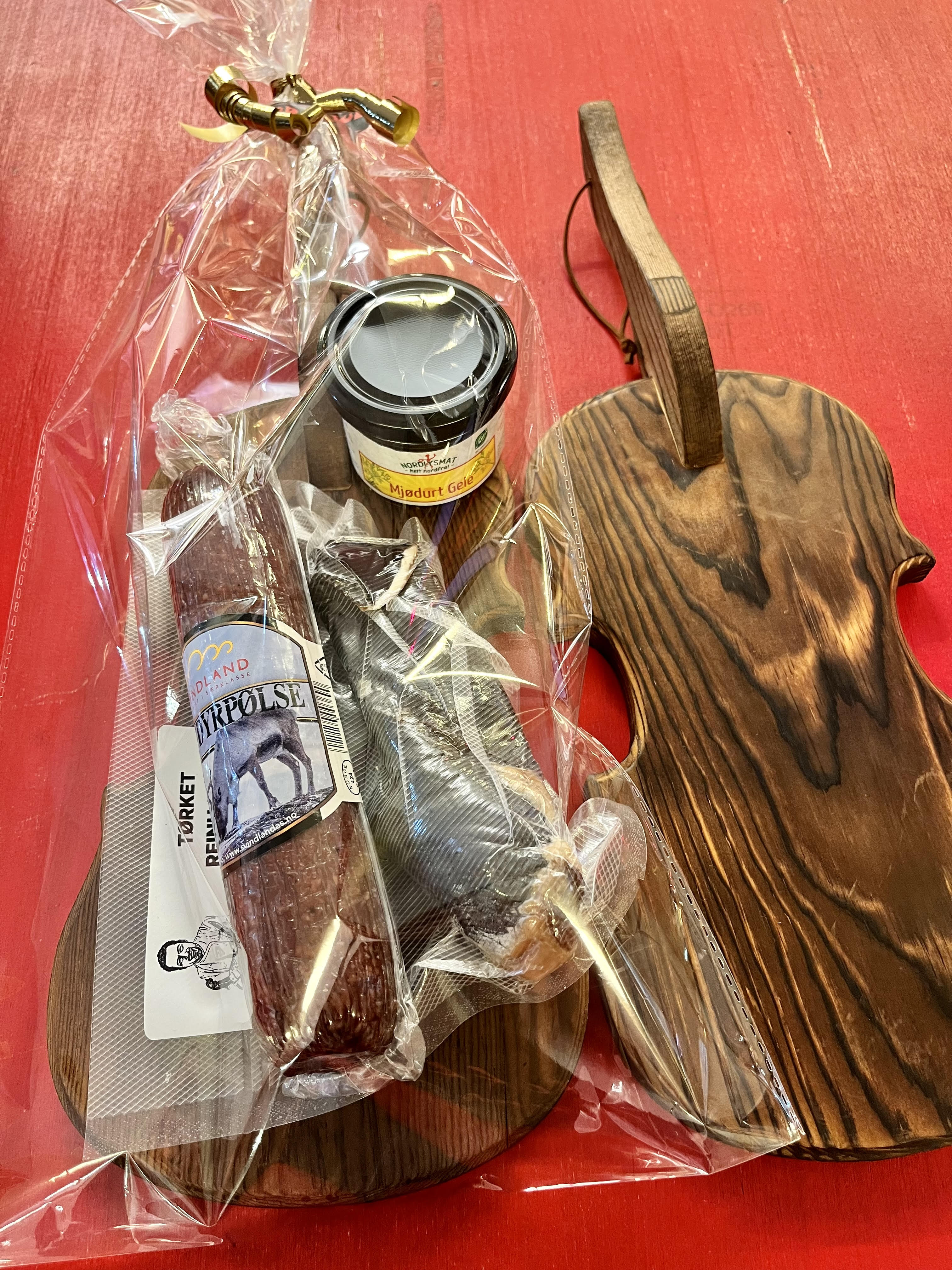 Gavepose med fele, tørket reinhjerte, reinpølse og mjødurtgelé