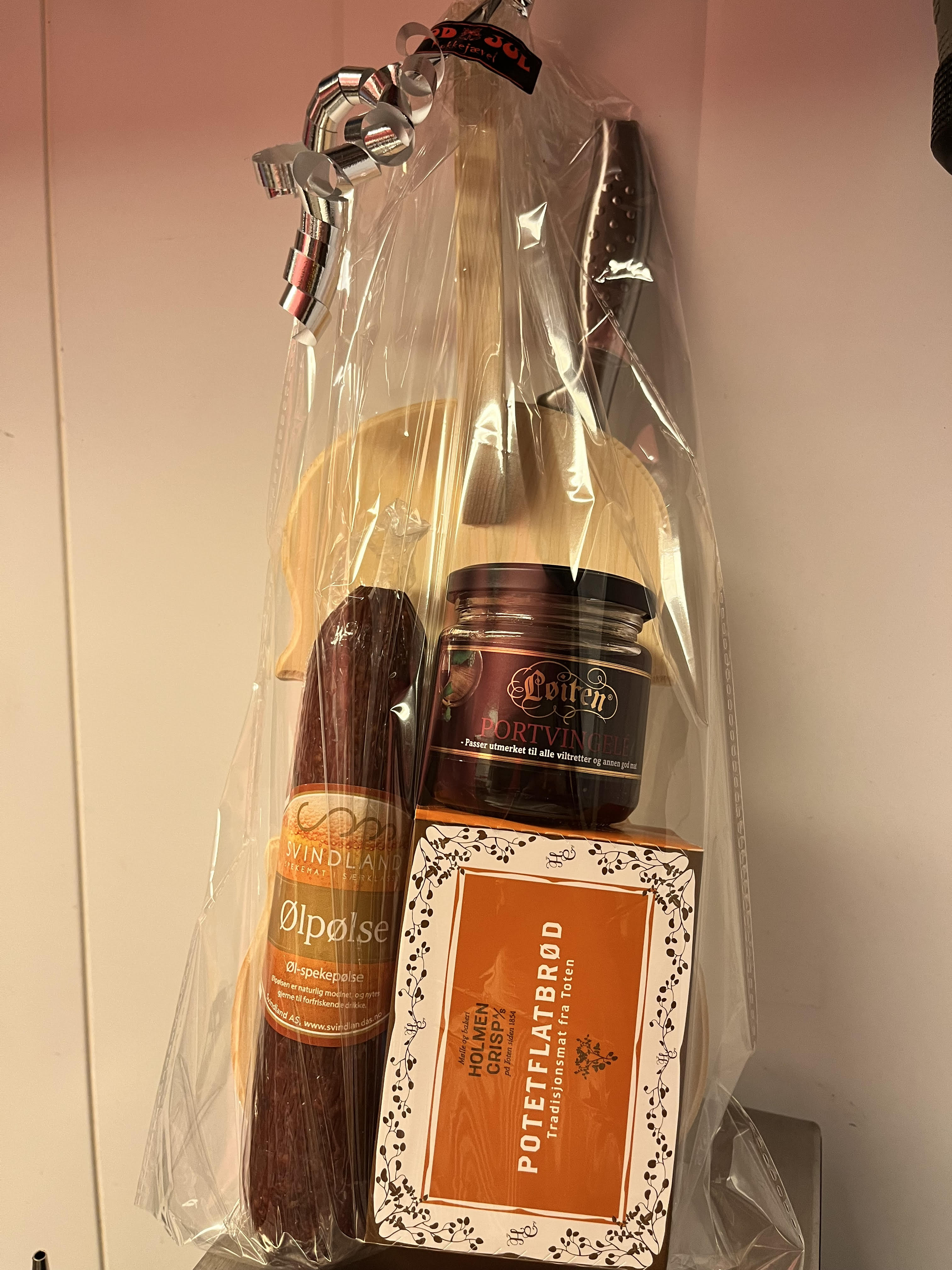 Gavepose Ølpølse på fele med innfelt kniv, portvingele og potetflatbrød