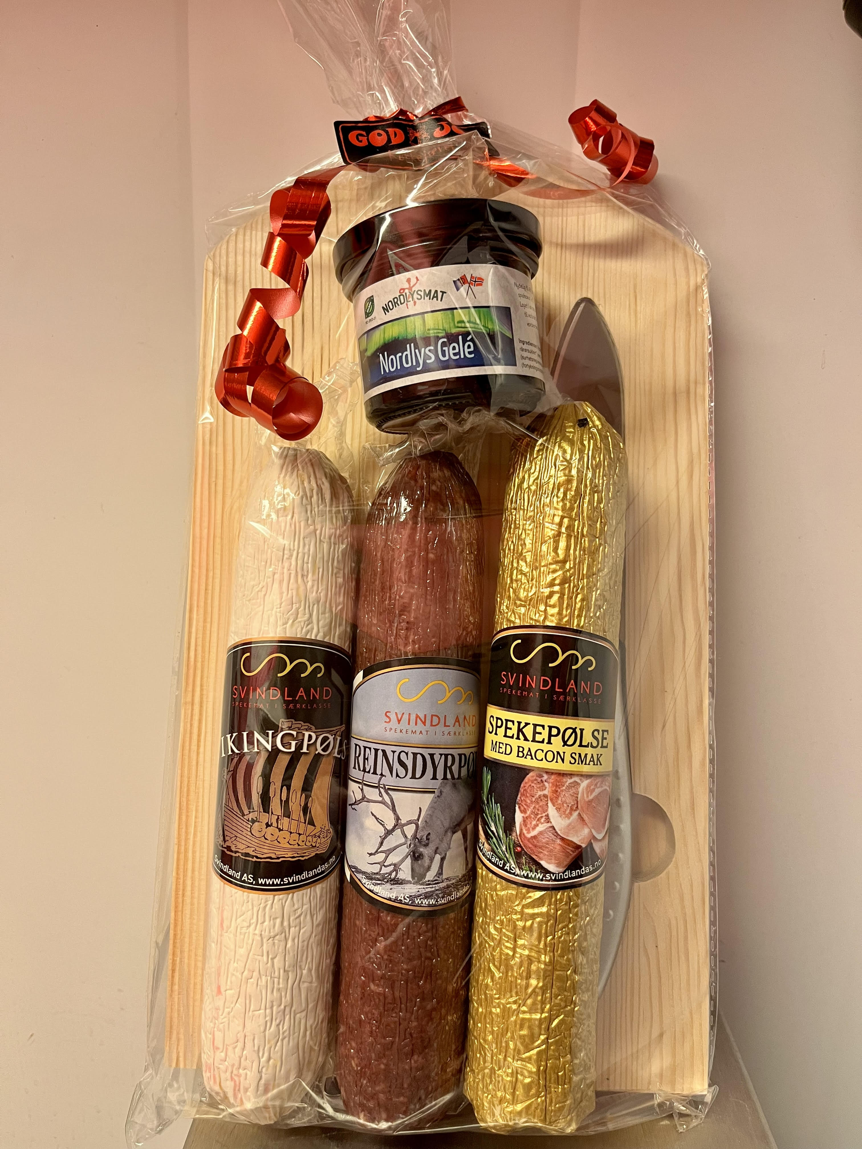 Gavepose Spekefjøl med innfelt kniv, 3 pølser og gele