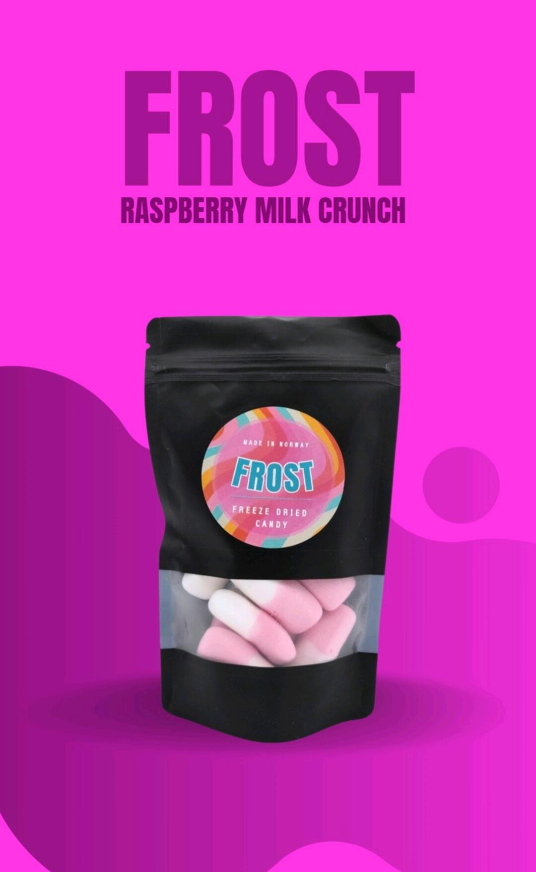 Frost Raspberry Milk Crunch! Denne søte og herlige godteriposen inneholder crunchy freeze dried godbiter med smak av søt og syrlig bringebær. Denne har en kjempeartig konsistens og smelter omtrent på tunga, samtidig som den gir et skikkelig krønsj når du tar deg en bit. Må prøves!