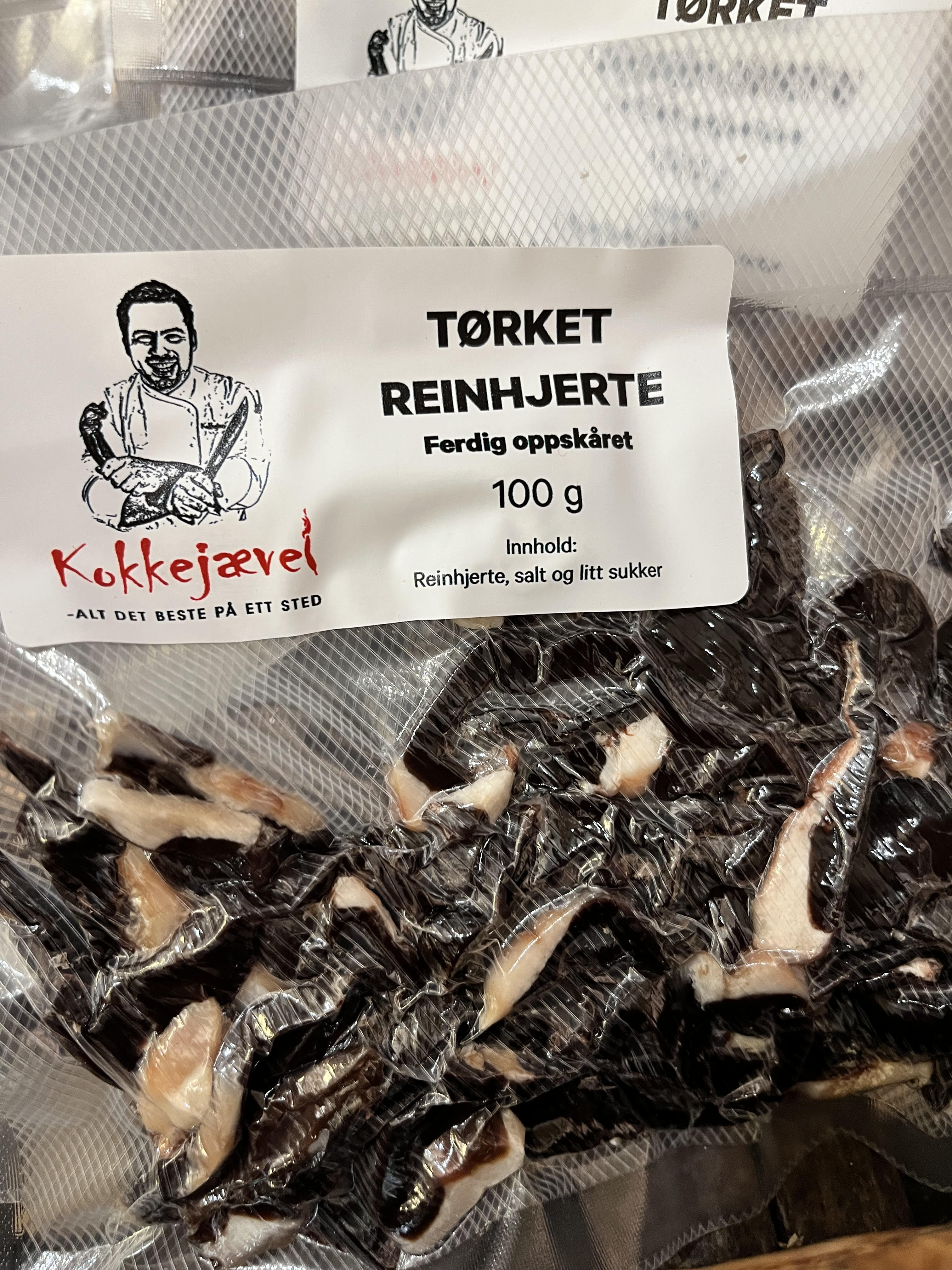 Tradisjonelt produsert tørket reinhjerte uten noen andre tilsetninger enn vanlig salt. Hjertet kommer vakuumert og anbefales nedfryst ved langtidslagring.