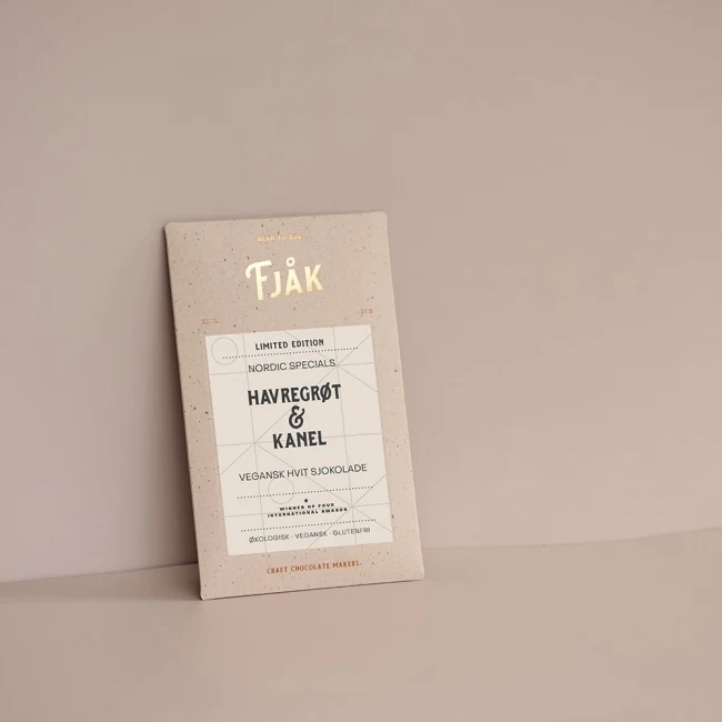 Kremete vegansk hvit sjokolade laget med havre og knasende sukker, toppet med en klype kanel.