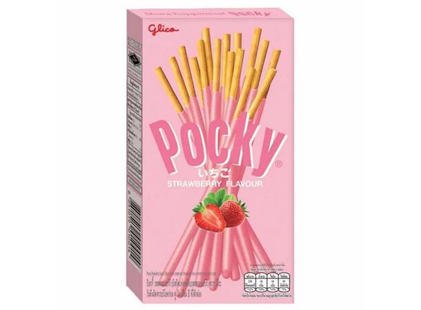 Pocky Strawberry er sprø, kjekspinner med jordbærsmak.