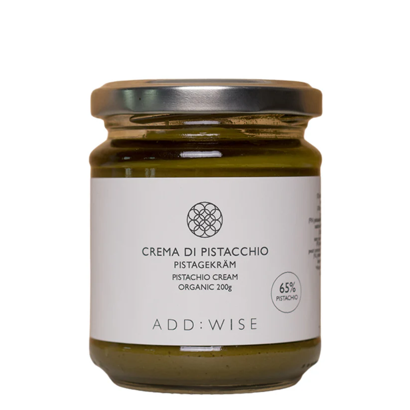 Økologisk pistasjekrem laget av 65 % rent produkt fra en liten produsent i Italia. Bruk fyllet på kaker eller bare som topping på isen din, det er drømmende! Skal du lage den berømte Dubaisjokoladen er dette pistasjen du trenger..