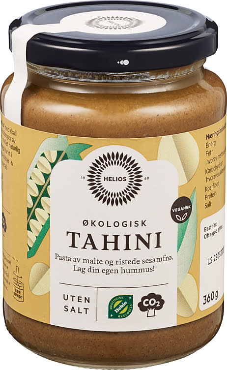 Helios Tahin er økologisk, uten salt og består av hele sesamfrø som er ristet og malt. Ingenting annet. Produktet er en kilde til kalsium og har et høyt innhold av vitamin B1 (tiamin), magnesium, sink og jern. Den har en herlig kvernet konsistens, og er kanskje mest kjent som en viktig ingrediens i hummus. Dette er et rent naturprodukt. Passer godt som pålegg, i sauser og dressinger.