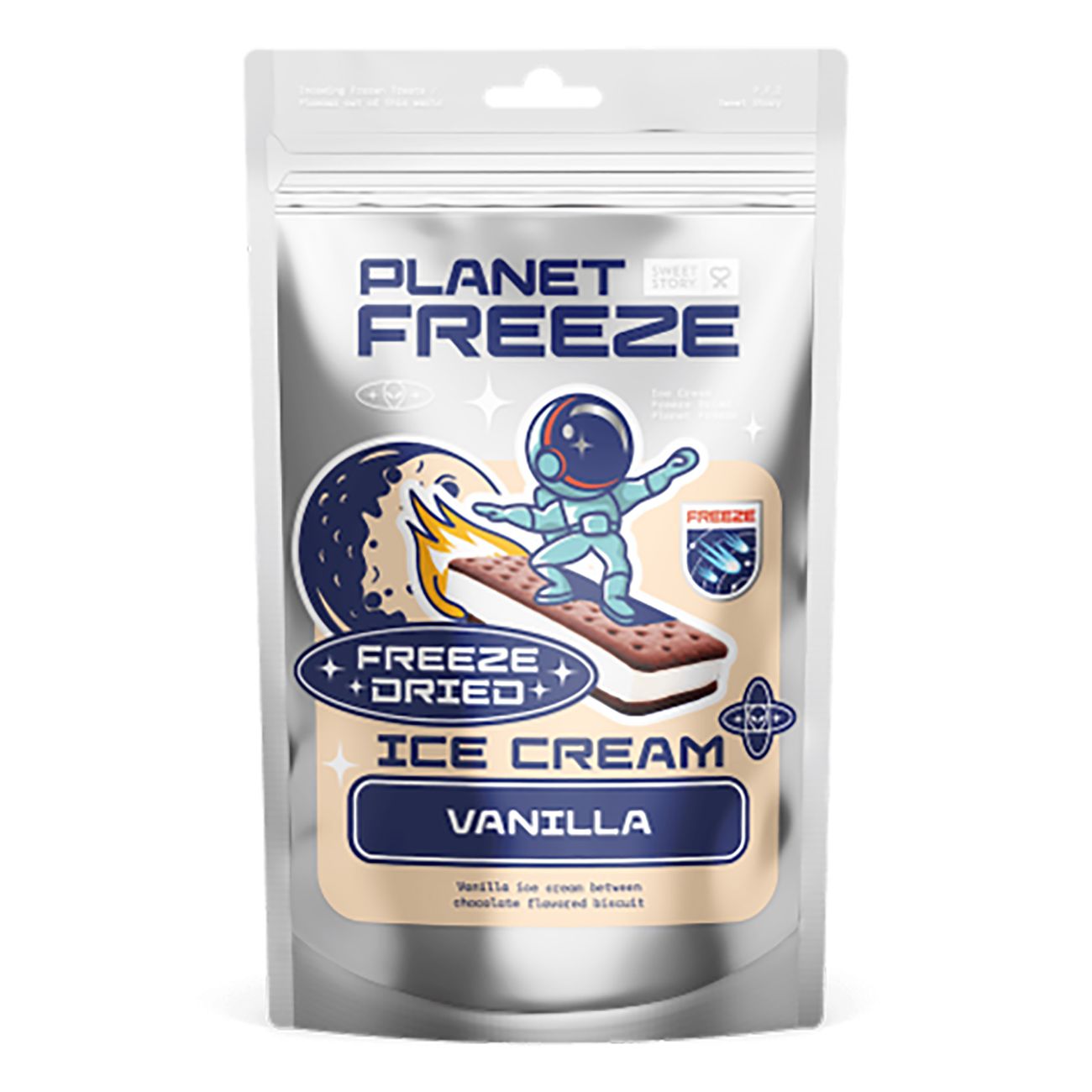 Vaniljeis fra verdensrommet! Planet Freeze er nemlig frysetørket vaniljeis mellom to sprø sjokoladekjeks - helt uten behov for fryser eller sommervær. Iselskerens svar på astronautmat!