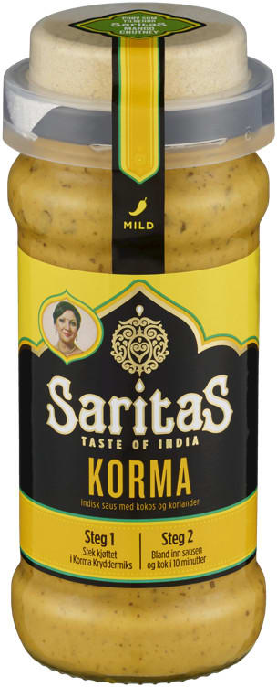 Saus 97%: løk, vann, kokosmelk, fløte, rapsolje, sukker, tomatpuré, modifisert maisstivelse, salt, krydder, kokos, koriander, spisskummen, hvitløk, sitronsyre, bukkhornskløver, ingefær, fargestoff (lutein). kryddermiks 3%: salt, løk, potetstivelse, rismel, kardemomme, sukker, nellik, muskatblomme, pepper, gurkemeie, kajanne, laurbærblad, rapsolje, fargestoff (paprikaekstrakt).