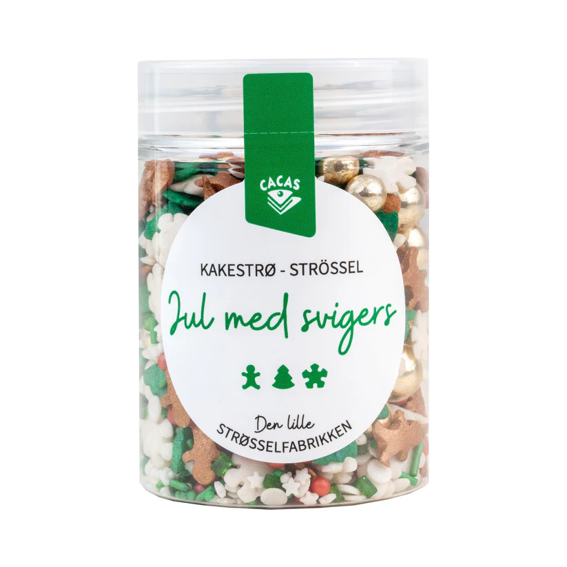 sukker, olje (solsikke), stivelse (potet, HVETE, ris), rismel, dekstrose, glukosesirup, gelatin (storfe, halal sertifisert), stabilisator (E414, E473), melkesjokolade [sukker, helMELKpulver, kakaosmør (min 20%), kakaomasse, emulgator (E322(SOYAlecitin)), naturlig vaniljesmak, kakaopulver (min 32%)], sprø kjerne [rismel, HVETEmel, sukker, maltmel (HVETE), HVETEgluten, salt], farge (E101, E133, E120, E153, E172, E174, E160b(ii)), antiklumpemiddel (E555), overflatebehandlingsmiddel (E903, E904). Allergener: HVETE, MELK, SOYA. Kan inneholde spor av fisk, peanøtter, nøtter, sennep, lupin.