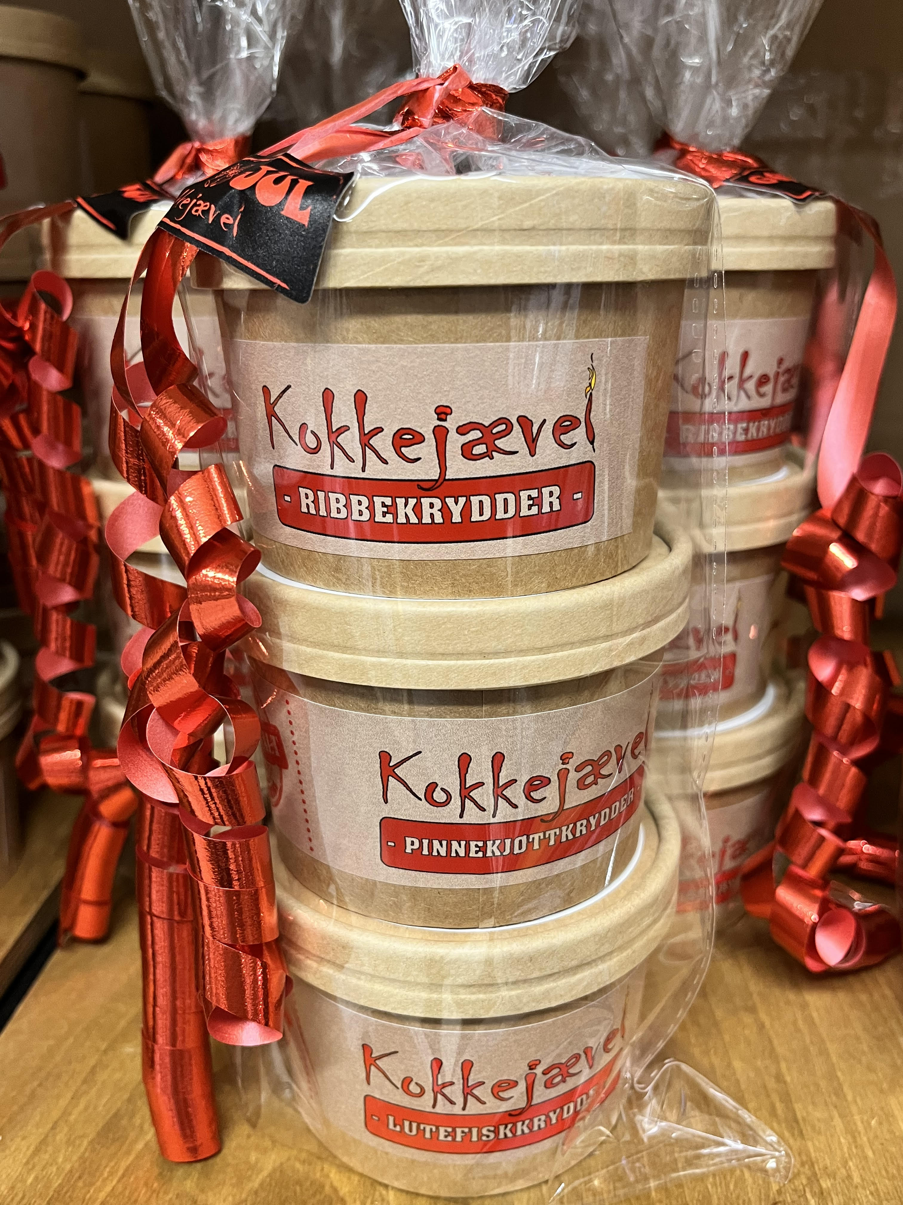 Inneholder ribbekrydder, pinnekjøttkrydder og lutefiskkrydder