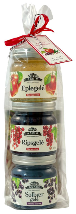 En flott gave med Eplegelé, Ripsgelé og Solbærgelé pakket fint i cellofanpose. Mye god smak for pengene og en gave som varer en stund. Husk at geléer har mange bruksområder, både som tradisjonelt pålegg, til vaffel, på ostefatet, som tilbehør til middag og som smakstilsetter i sauser og gryter.
