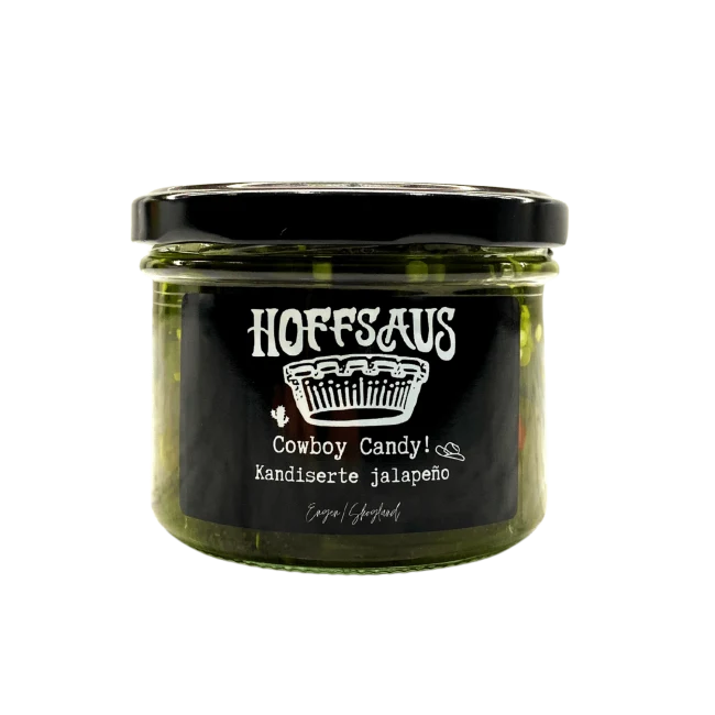 Skiver av jalapeno som blir kokt i en lake med eddik og sukker. Den får en fast og sprøkonsistens, og kombinasjonen søtt og sterkt synes vi er helt magisk.