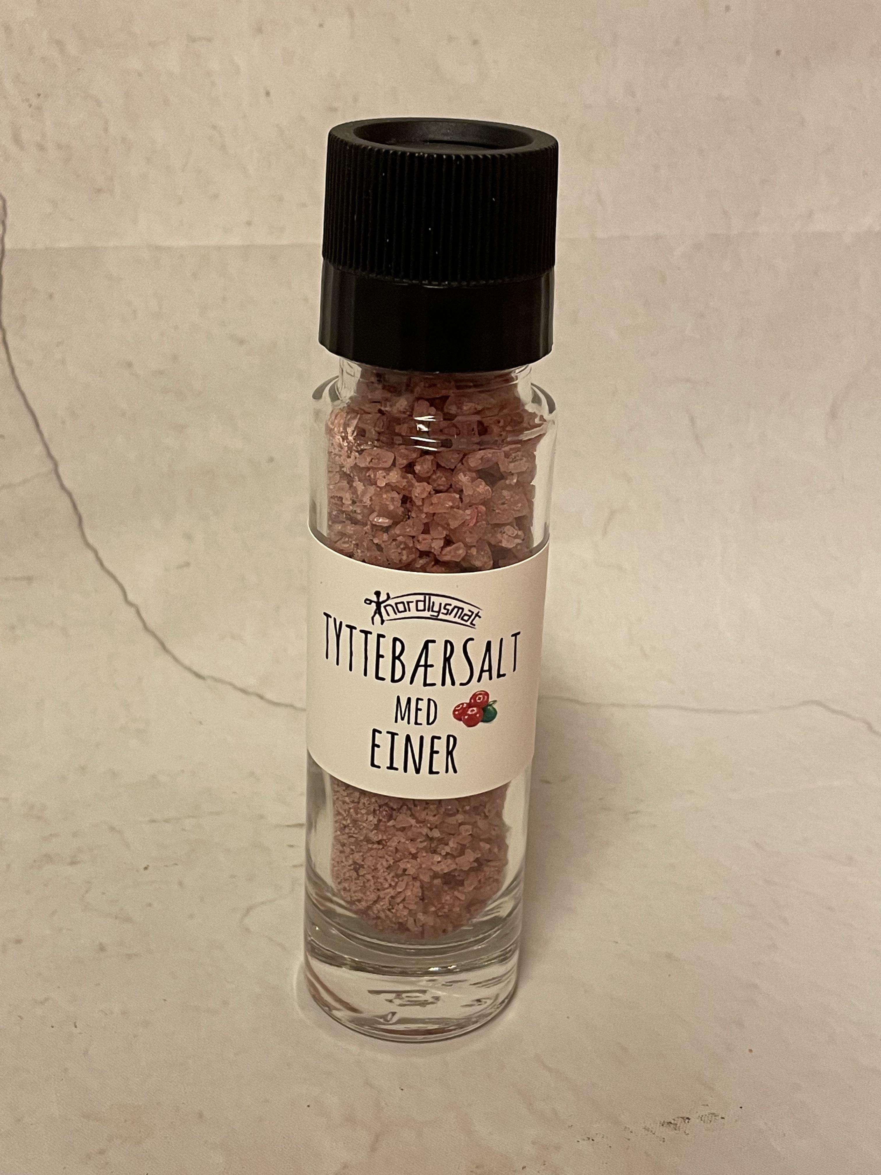 Et helt fantastisk godt salt, både på farge og smak! Med hint av både tyttebær og eier, så er det et førstevalg til ryper, rein og annet vilt, men er også godt til annet kjøtt. Ikke minst til retter som kjøttkake, kjøttpudding og andre retter der tyttebær ofte naturlig inngår.