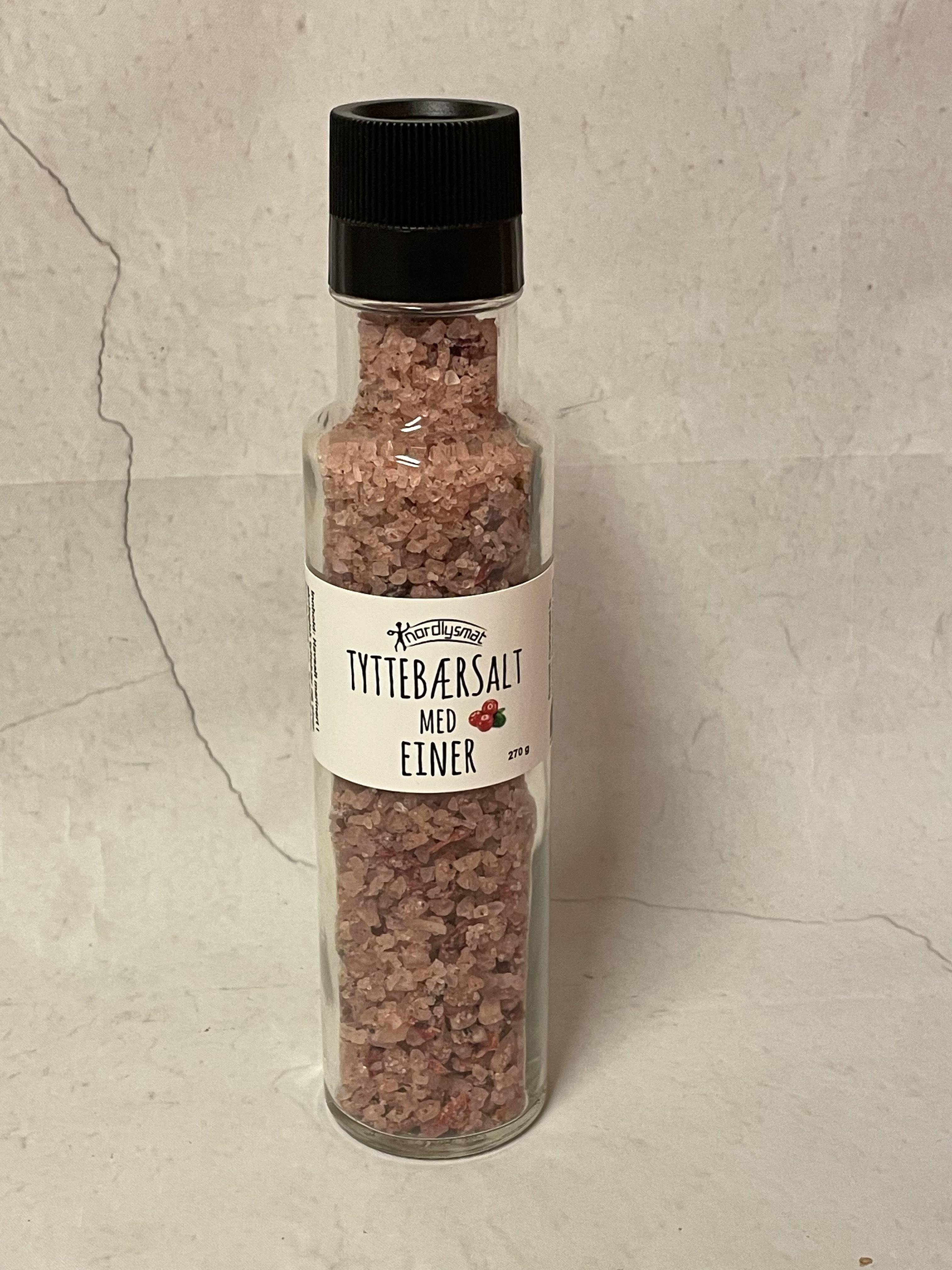 Et helt fantastisk godt salt, både på farge og smak! Med hint av både tyttebær og eier, så er det et førstevalg til ryper, rein og annet vilt, men er også godt til annet kjøtt. Ikke minst til retter som kjøttkake, kjøttpudding og andre retter der tyttebær ofte naturlig inngår.