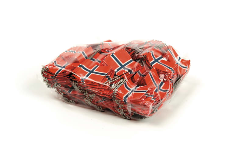 Norske flagg med knappenål. Godt egnet til pynting av mat, desserter og kaker.