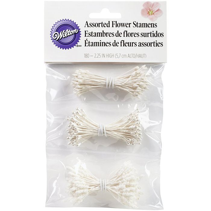 180 støvbærere til royal icing og marsipanblomster. Inkl. 60 Pearl, 60 Glitter, 60 Fluffy. 3,2 cm lange. Kan farges (unntatt Pearl)