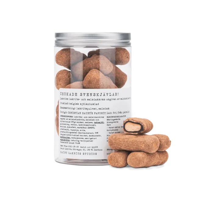Chokade Svenskjävlar 250gr - lakris og salmiakkrem med sjokolade. Myk lakris- og salmiakk-krem omgitt av et tynt lag med salmiakk-lakris rullet i enorme mengder salmiakk-salt og til slutt dyppet i søt belgisk sjokolade. Kombinasjonen av søtt og salt gjør dette til en bombe av en lakris!