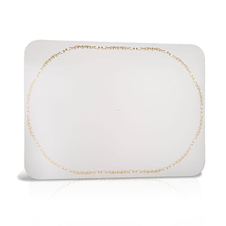 Pent hvitt kakebrett med dekorkant i gull. Laget av bestrøket kartong og er av god og stødig kvalitet.Størrelse 34x46 cm.