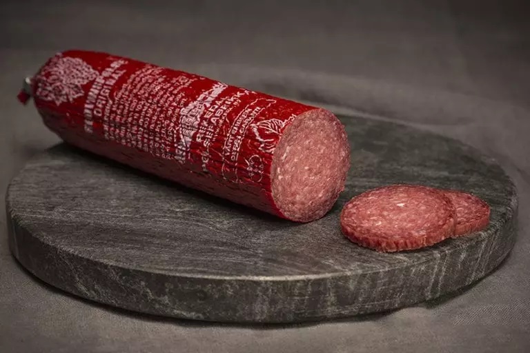 Svinekjøtt, storfekjøtt, salt, krydder, hvitløk, rødvinsaromat 0,12%, rødvinsekstrakt (sulfitt), konserveringsmiddel E250, antioksidant E301, farge E120.