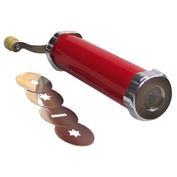 Småkakepresse i rustfritt stål som passer perfekt til kransekake, berlinerkranser og andre småkaker.