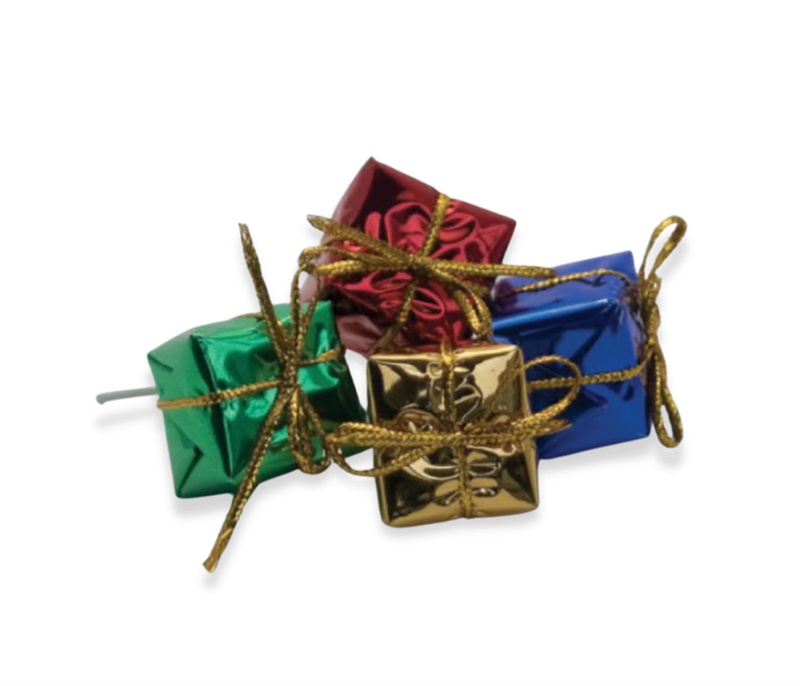 Ass farger på pakker med gavebånd som er festet til en pinne på ca 2 cm. Pakkene stikker du enkelt i en kake, cupcake, donuts eller i et annet bakverk.