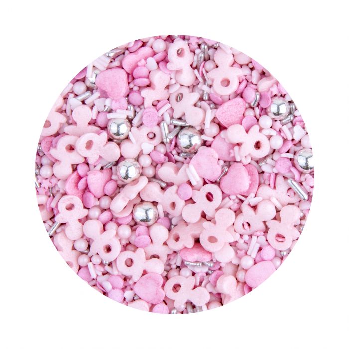 Miksen består av strø med babymotiv og inneholder smokker, perler, crispy kuler, vermicelli m.m. i nydelige rosa toner.