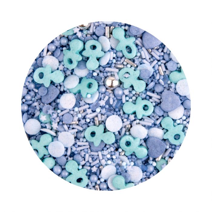 Miksen består av strø med babymotiv og inneholder smokker, perler, crispy kuler, vermicelli m.m. i nydelige blåtoner.