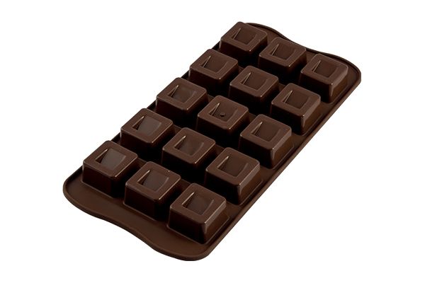 Konfektform i silikon med Firkanter fra Silikomart, 15 stk på brettet.