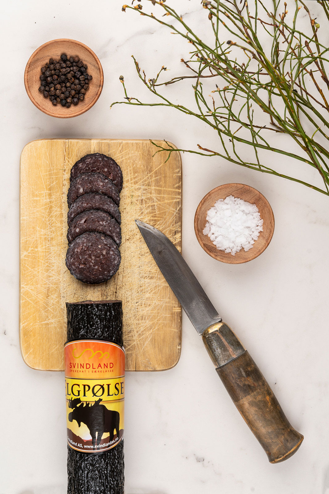 En nydelig mørk pølse med den karakteristiske elgsmaken. Like god på spekebordet som til snacks.