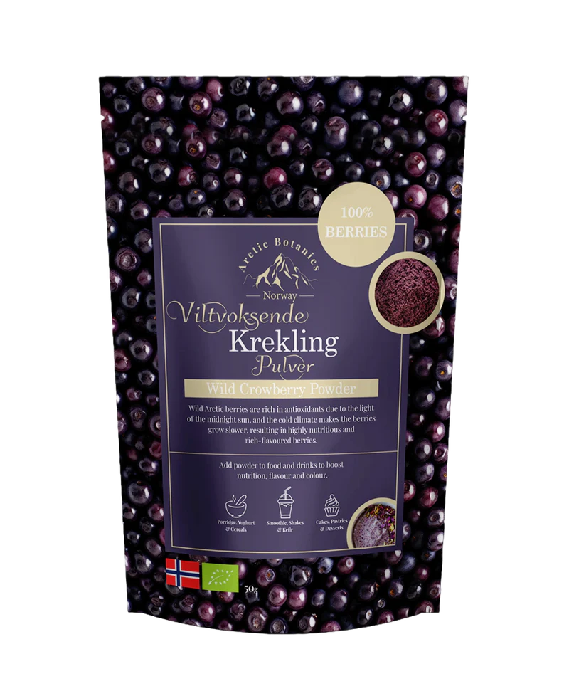 Økologisk krekling (Empetrum nigrum) pulver er laget av håndplukkede krekling fra den vakre urørte naturen i Nord-Norge. Kreklingpulver gir en fyldig smak av frisk krekling. For en smak-, næring- og farge boost, tilsett 1-2 ts. pulver i smoothie, grøten, yoghurt, frokostblanding eller bakst.