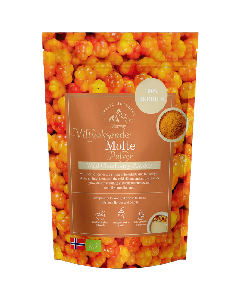 Økologisk molte [Rubus chamaemorus] pulver laget av håndplukkede molter fra nord for polarsirkelen i Nord-Norge. Molter er også kjent som det nordiske gullet, og mange anser molter som kongen av viltvoksende bær. Tilsett moltepulver for en næring-, smak- og farge boost. Tilsett 1-2 ts. pulver i smoothie, grøten, yoghurt, frokostblanding.