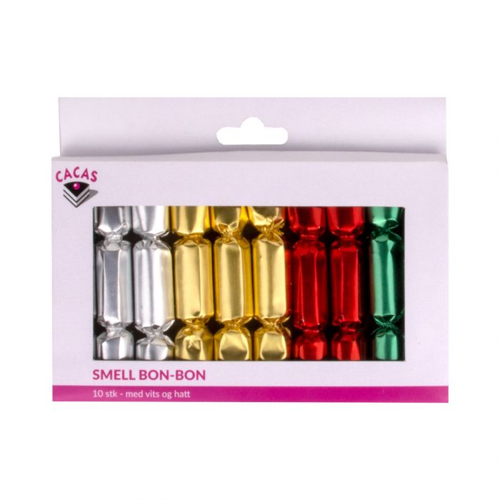 Inneholder 10 stk smell bon-bon med vits og hatt.