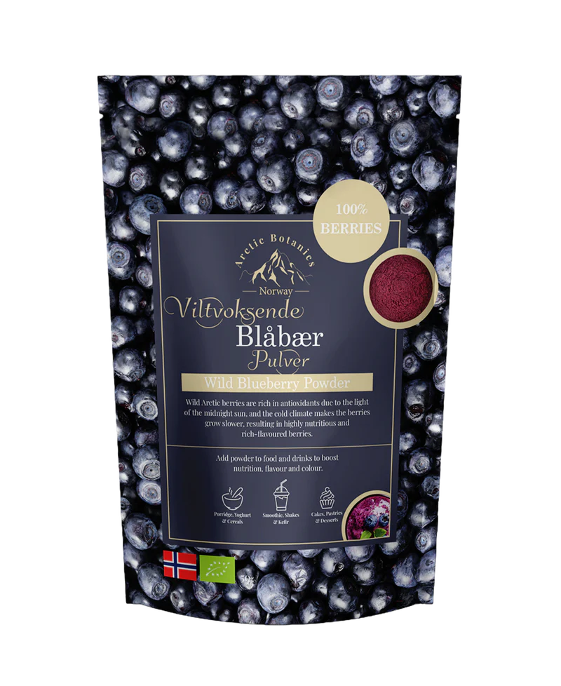 Økologisk blåbær [Bilberries, Vaccinium myrtillus] pulver laget av håndplukkede viltvoksende blåbær fra den urørte naturen i Nord-Norge. Blåbærpulver gir en smak av friske, viltvoksende nordiske blåbær. Tilsett 1-2 teskje pulver daglig i smoothie, grøten, yoghurt, frokostblanding eller bakst for en smak-, næring-,og farge boost.